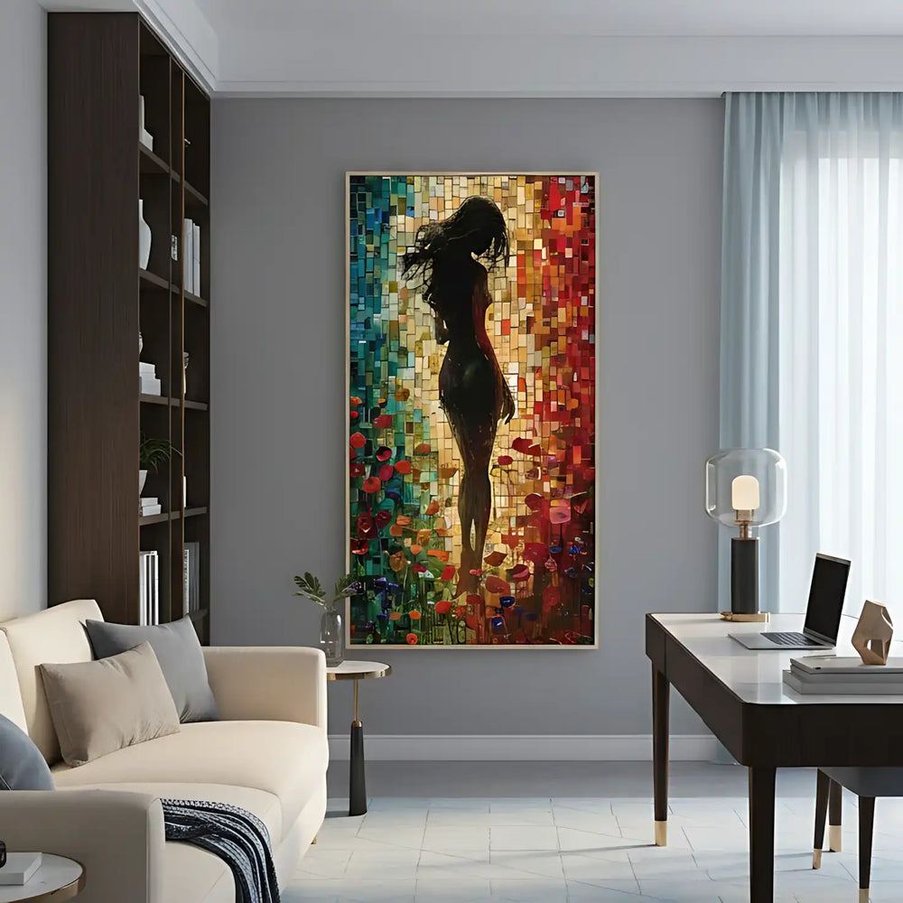 🎨 Cette œuvre captivante révèle une silhouette féminine contemplative se détachant sur un fond de mosaïque colorée aux reflets chatoyants. Les fleurs délicates et la chevelure fluide créent une harmonie poétique saisissante.