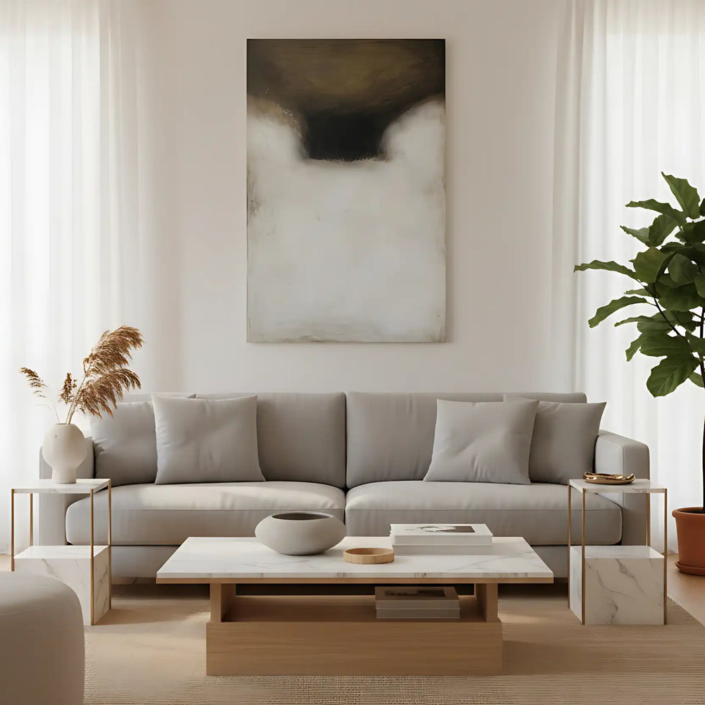Tableau abstrait en tons beige et brun avec ombres profondes. Atmosphère mystique, idéal pour un salon moderne.