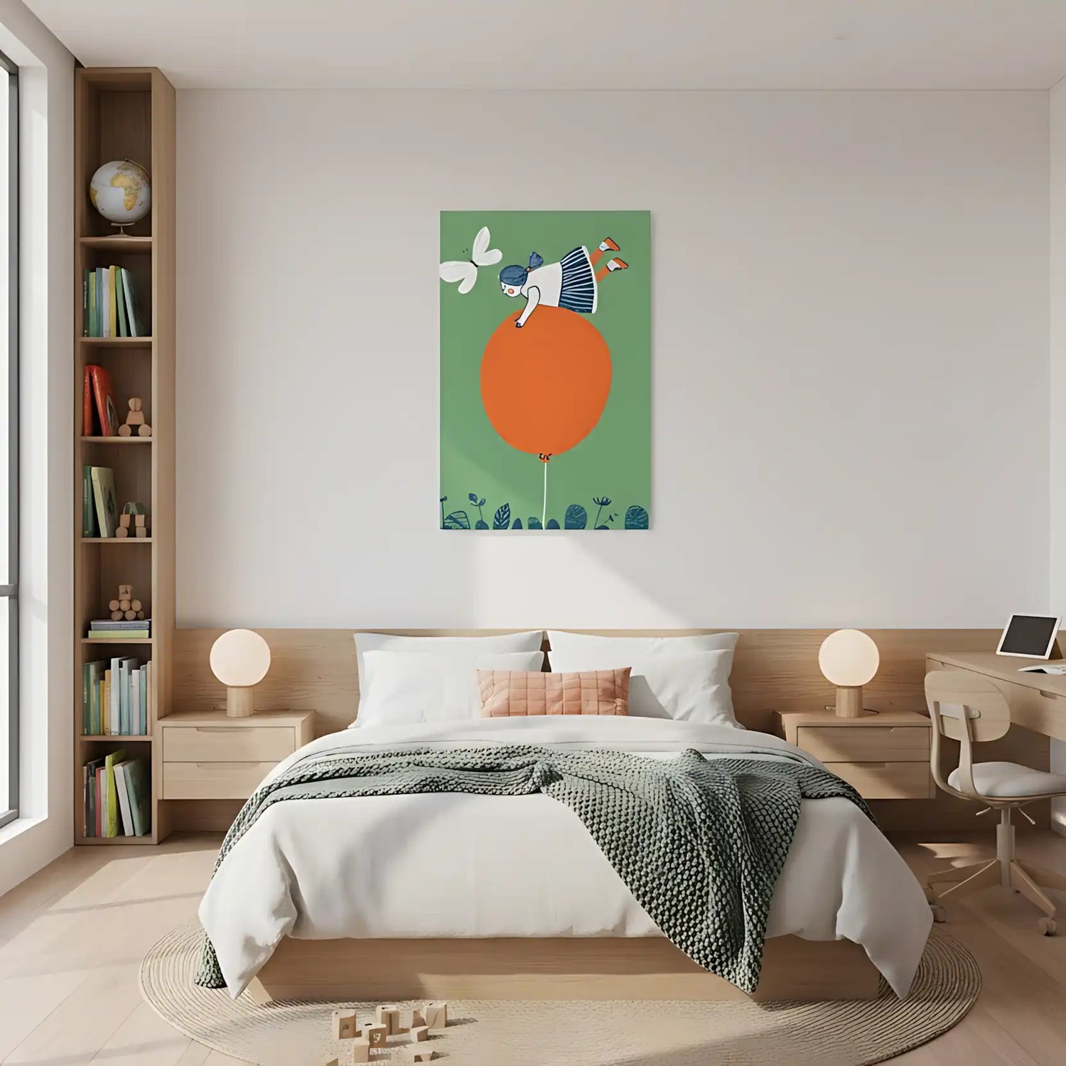 Illustration d'une fille perchée sur un ballon orange, entourée de plantes et d’un papillon. Une scène ludique et joyeuse, parfaite pour une chambre d'enfant créative.