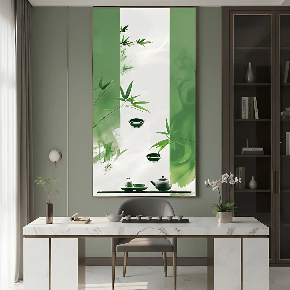 Tableau zen avec bambou et service à thé en vert et blanc. Ambiance apaisante, idéal pour un salon ou une salle de méditation.