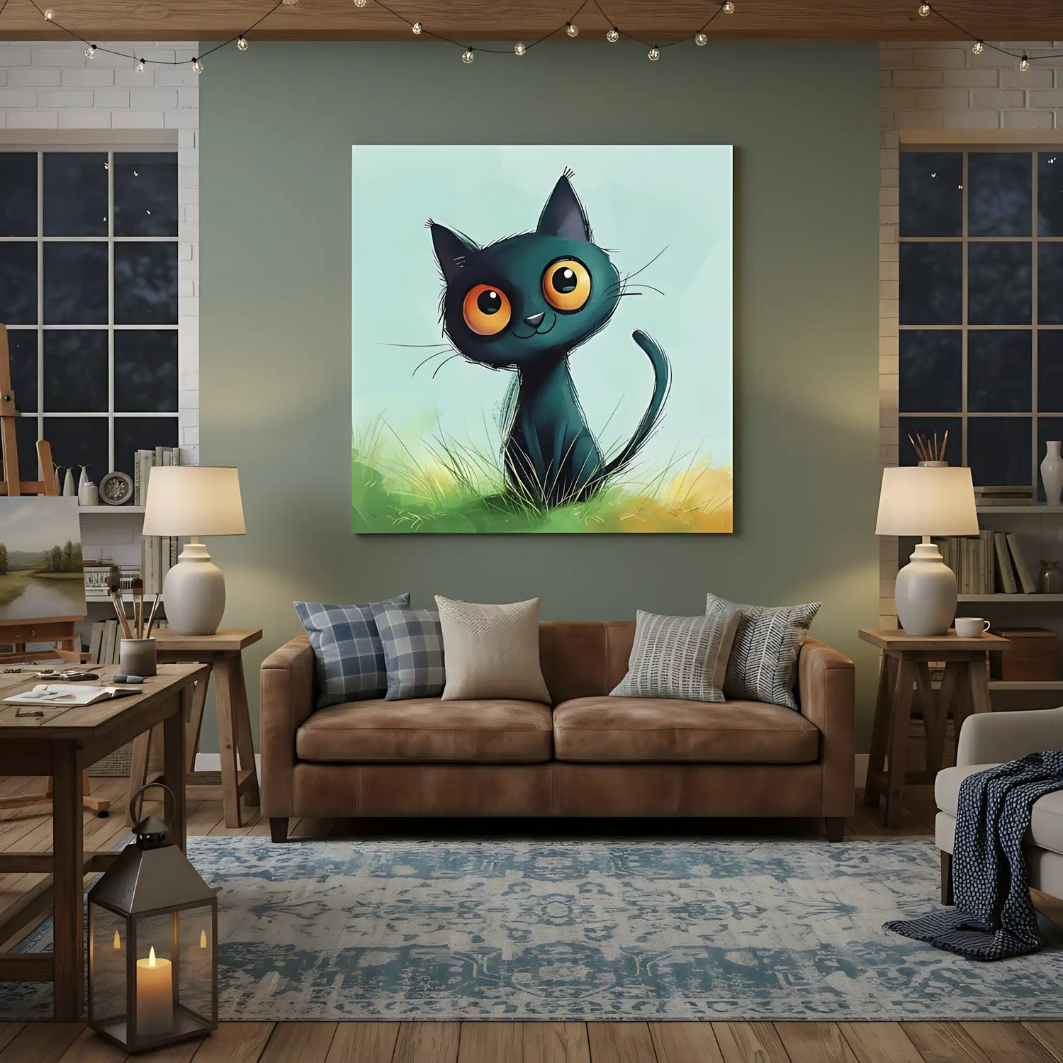 Chat noir mignon avec grands yeux, dans l'herbe verte, art animalier joyeux et ludique, parfait pour une chambre d'enfant.