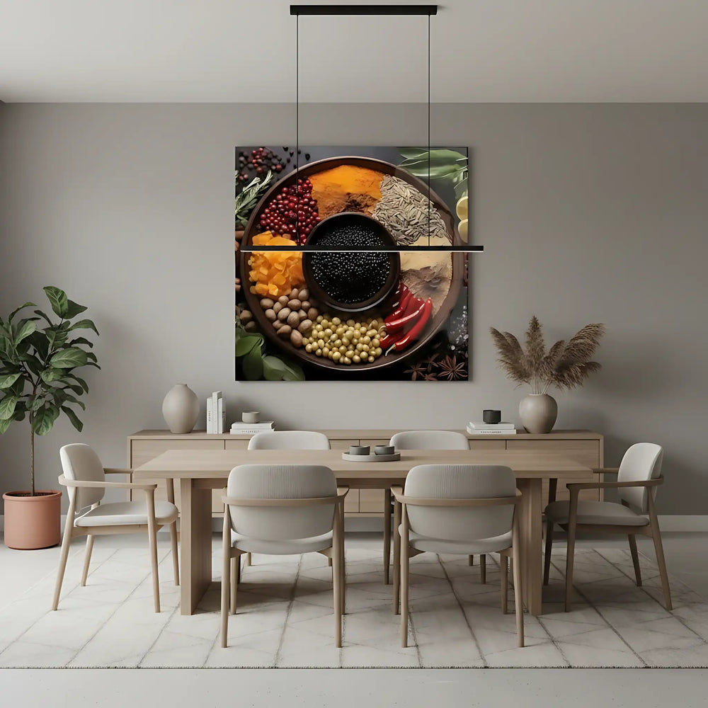 🎨 Cette nature morte culinaire moderne révèle un arrangement sophistiqué d'épices et graines dans un équilibre parfait. Les couleurs terre et chaleur - rouge épicé, jaune doré, noir profond - créent une harmonie visuelle captivante qui évoque l'authenticité des saveurs du monde.