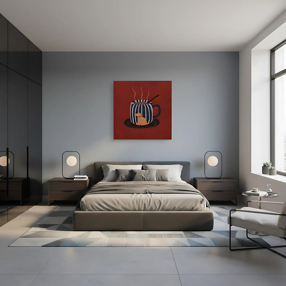🎨 Découvrez cette illustration moderne minimaliste où un adorable chat orange se love dans une tasse de café rayée. Le rouge bordeaux profond et les contrastes noir et blanc créent une atmosphère particulièrement chaleureuse et accueillante.