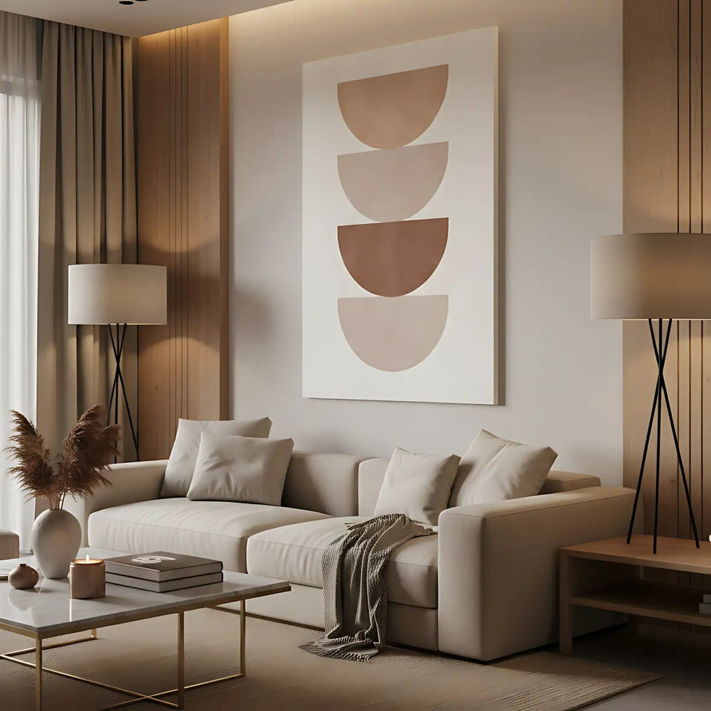 Oeuvre minimaliste avec demi-cercles beige et marron, ambiance sereine et élégante pour salon ou bureau moderne.