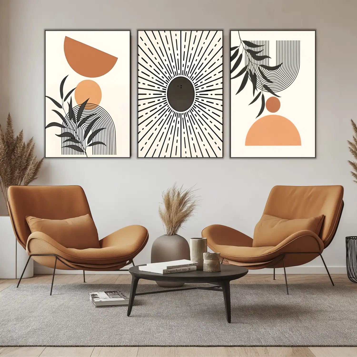 🎨 Cette composition géométrique abstraite révèle un dialogue subtil entre cercles, arcs et lignes verticales. Les tons terreux et corail se mêlent dans une danse visuelle apaisante, ponctuée de points dispersés qui ajoutent dynamisme et poésie à l'ensemble.