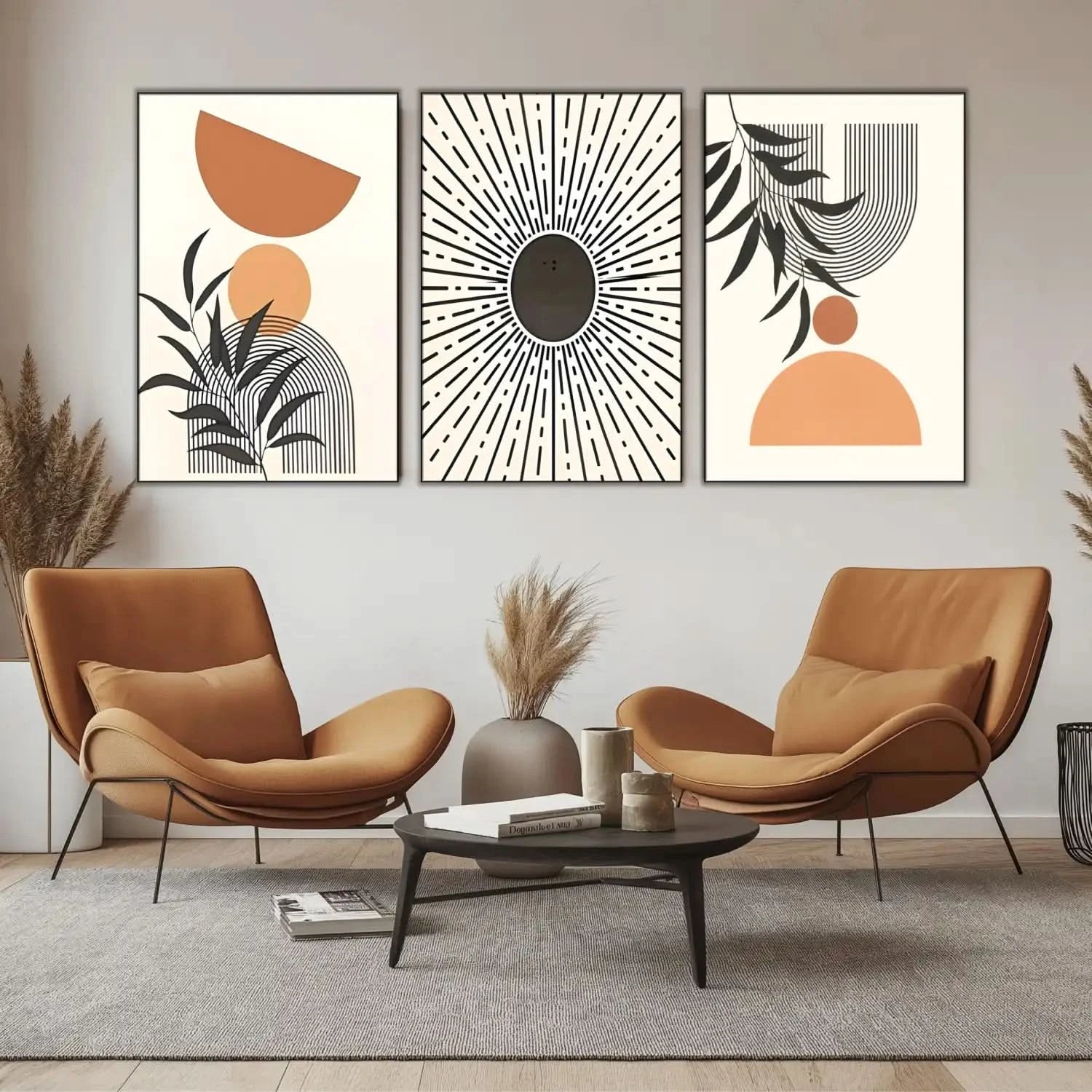 Œuvre minimaliste avec formes géométriques en tons terreux, lignes noires, ambiance chaleureuse et apaisante pour salon ou bu