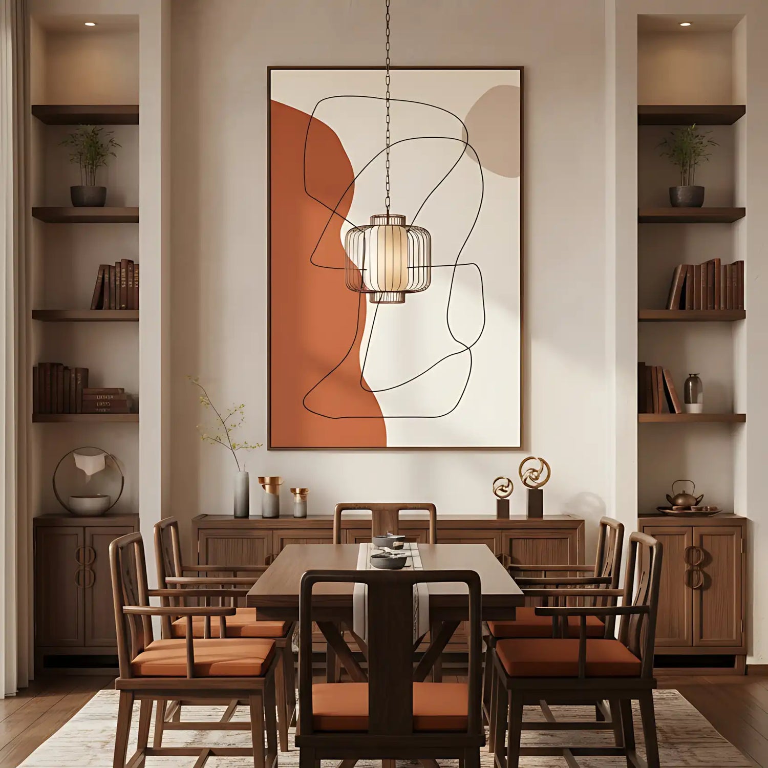 Oeuvre minimaliste avec lignes noires sinueuses et formes brunes sur fond beige, ambiance apaisante pour salon moderne.