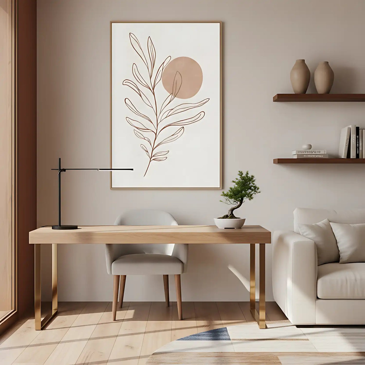 Tableau minimaliste avec branche en brun terreux et cercle beige, ambiance zen et naturelle pour salon ou chambre moderne.
