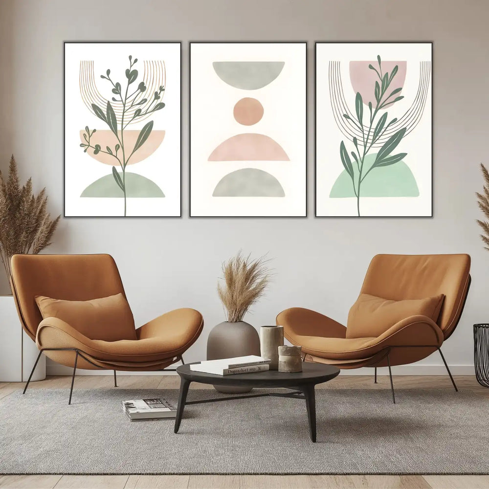Tableau minimaliste avec branche verte et formes géométriques pastel, ambiance sereine pour salon ou chambre moderne.
