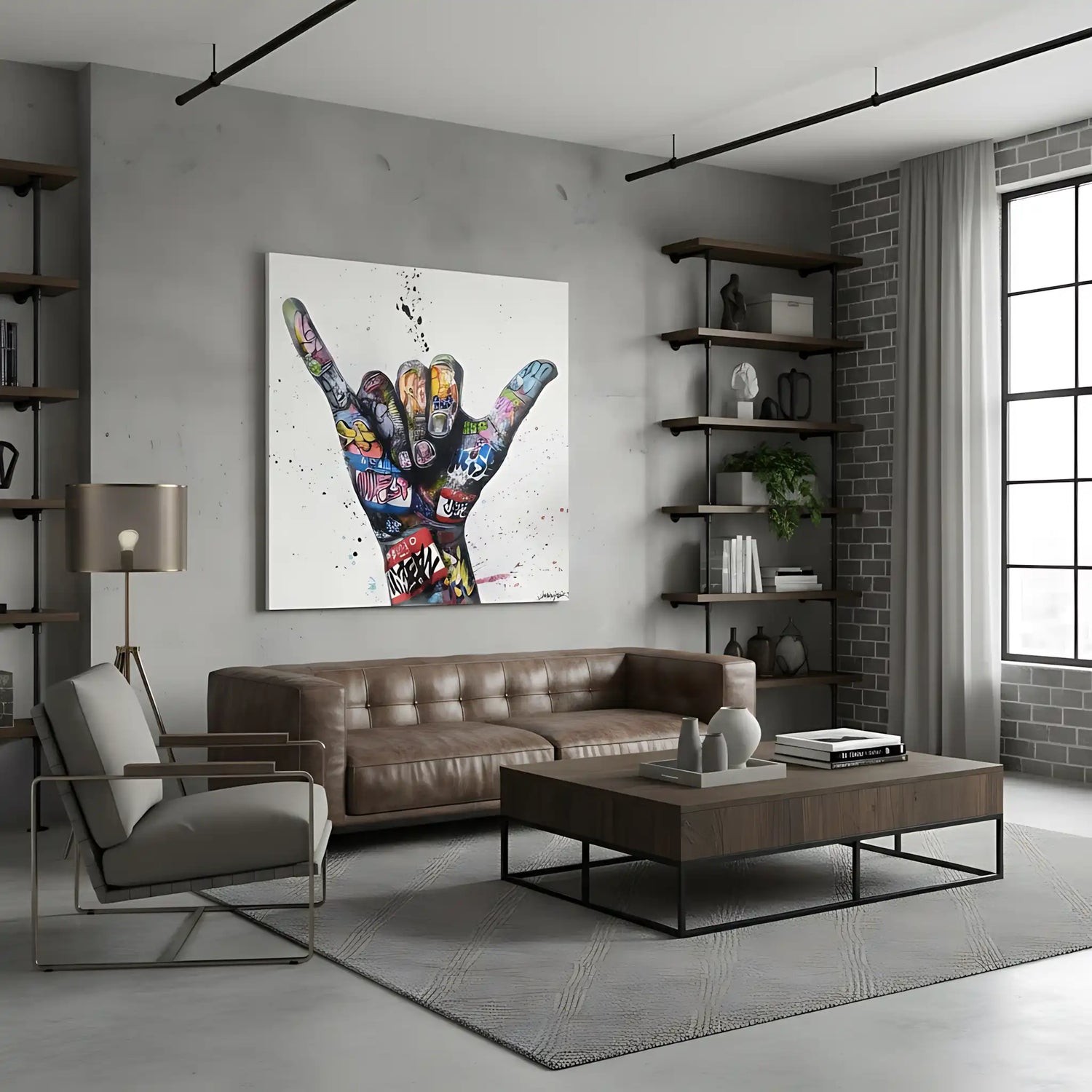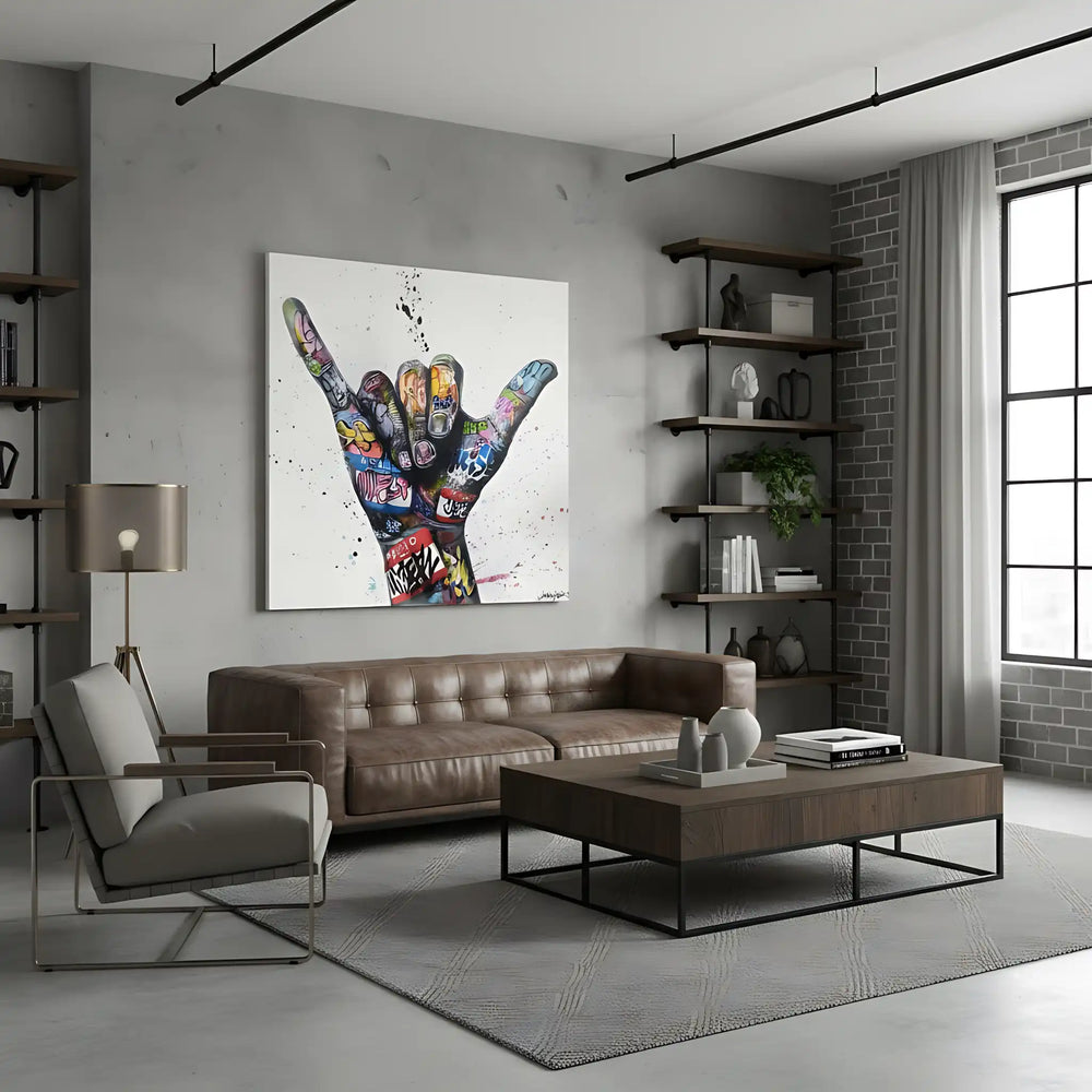 🎨 Cette œuvre de street art contemporain transforme le geste iconique du shaka en explosion créative multicolore. Les couleurs pop acidulées - bleu électrique, rose fluo et jaune vif - se mélangent dans un effet spray dynamique qui capture l'énergie pure de la rue.