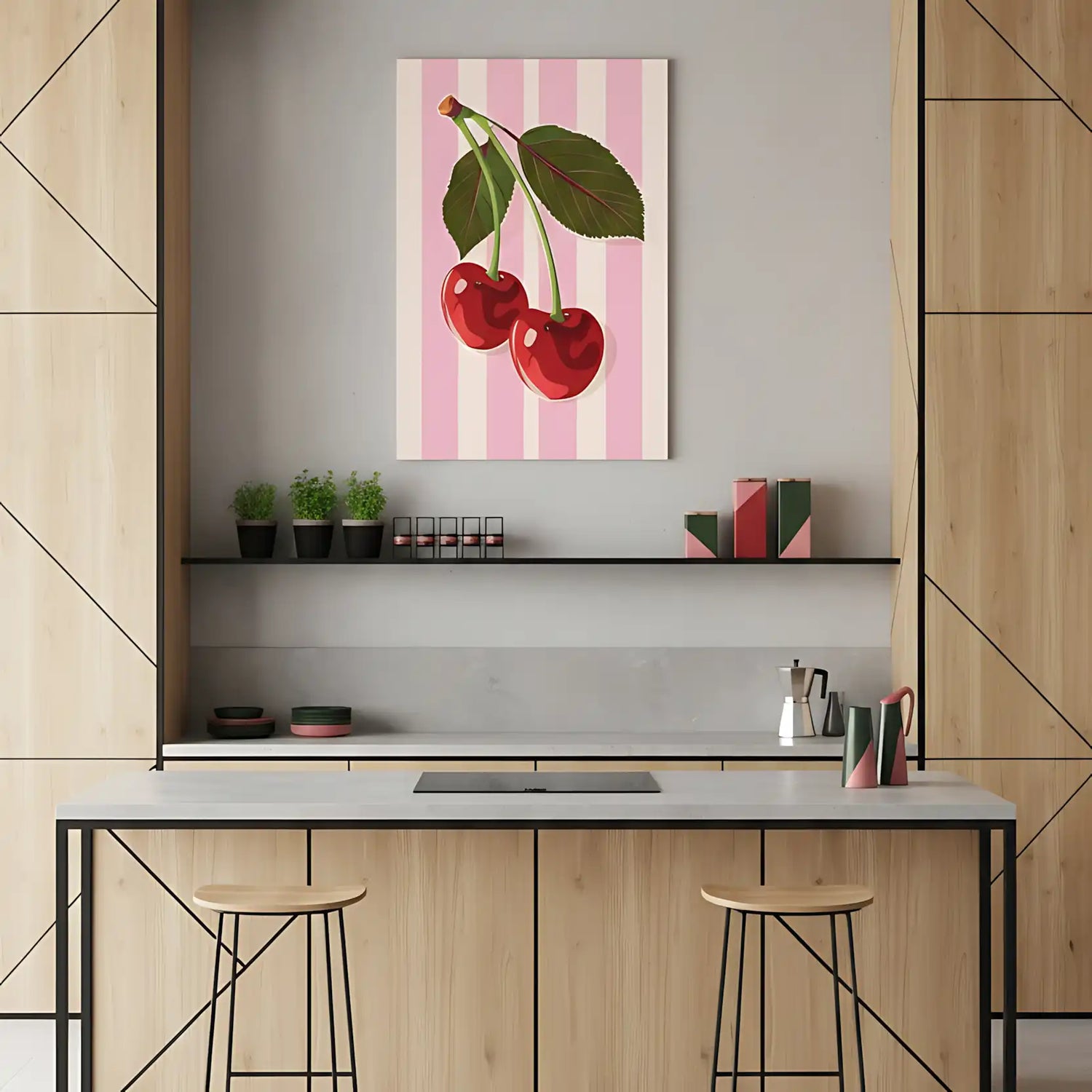🎨 Cette œuvre Pop Art vintage transforme de simples cerises en icônes vibrantes de la culture rétro. Les couleurs vives et les rayures délicates créent une composition pleine de charme et de caractère.