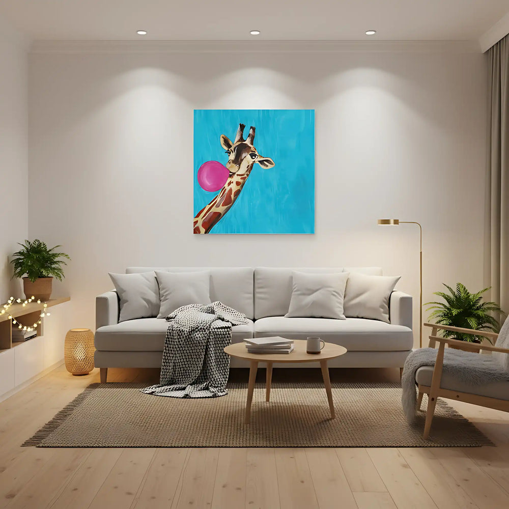 🎨 Cette œuvre Pop Art ludique transforme l'ordinaire en extraordinaire avec une girafe espiègle qui souffle une bulle rose fuchsia sur un fond bleu turquoise vibrant. Un clin d'œil artistique qui célèbre la fantaisie et l'inattendu.