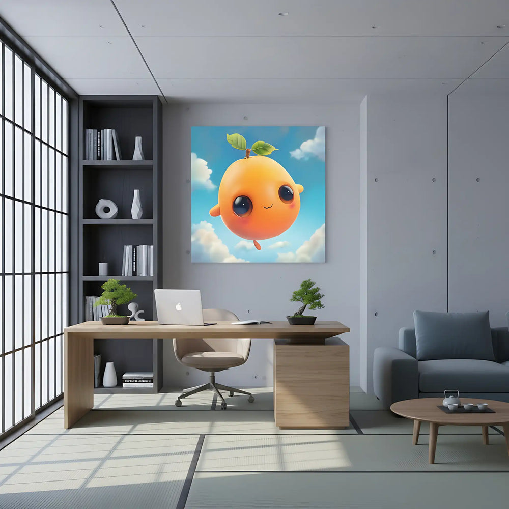 🎨 Cette adorable création en art numérique 3D kawaii présente un personnage orange aux grands yeux expressifs, flottant avec grâce parmi les nuages d'azur. Son design anthropomorphe et sa texture brillante créent une présence attachante et réconfortante.