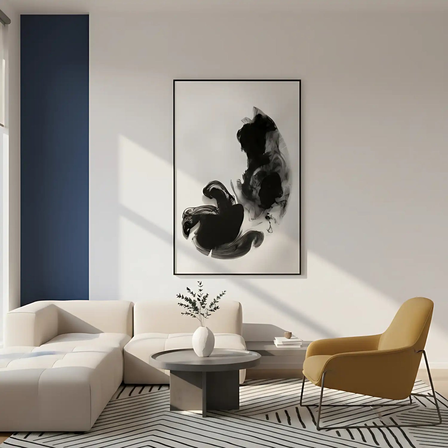 🎨 Cette œuvre d'art abstrait fluide capture l'essence mystérieuse de l'encre dans l'eau, créant des formes organiques d'une beauté envoûtante. Les nuances de noir profond sur fond gris pâle évoquent un univers contemplatif et poétique.