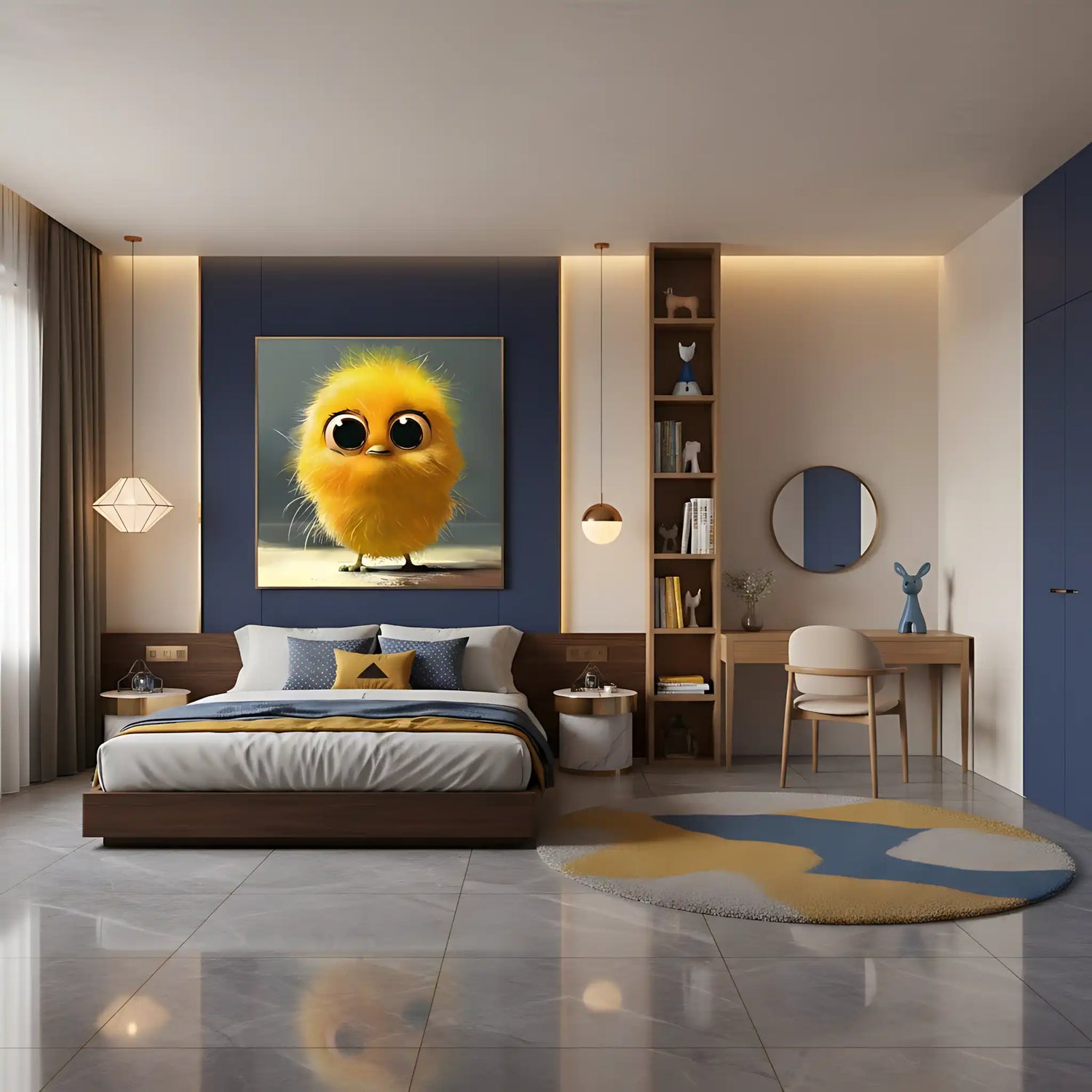 Petit oiseau jaune aux grands yeux, mignon et doux, parfait pour une décoration pleine de charme.