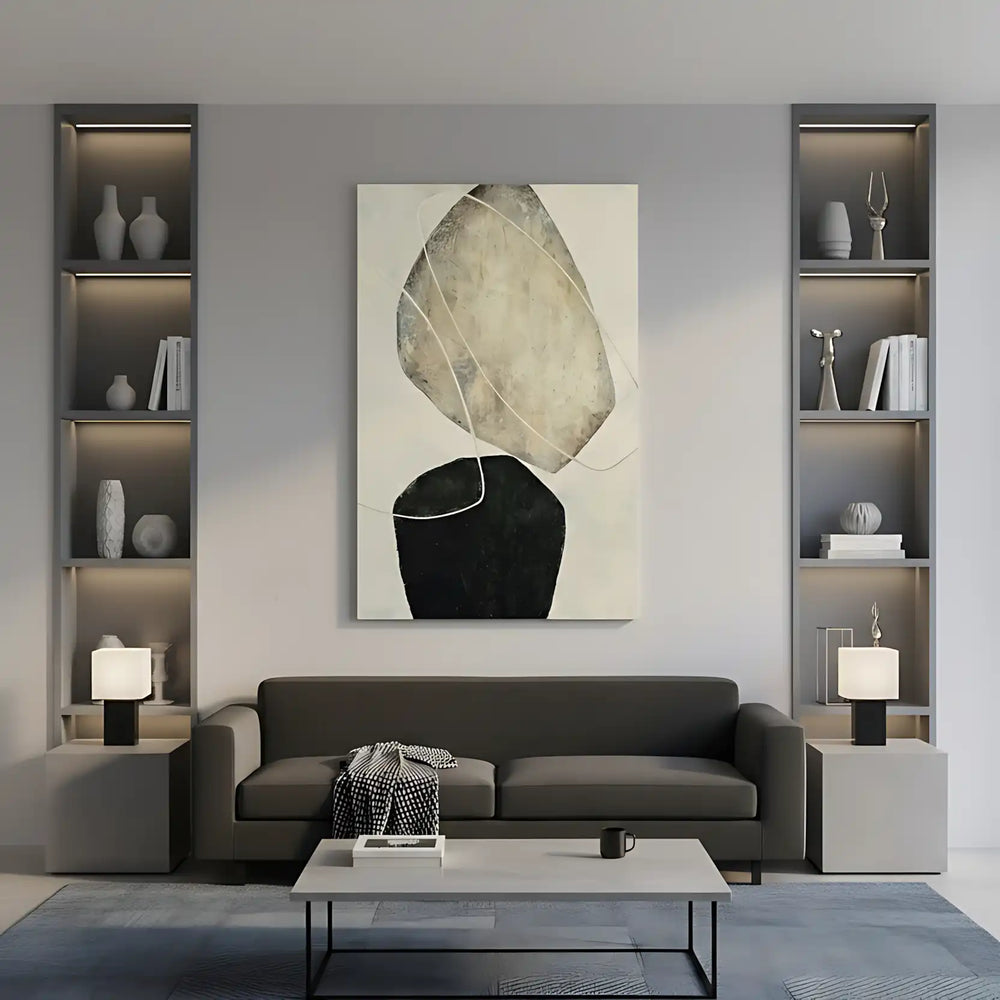 Tableau abstrait avec formes suspendues en tons beige et noir. Style moderne, idéal pour un salon épuré.