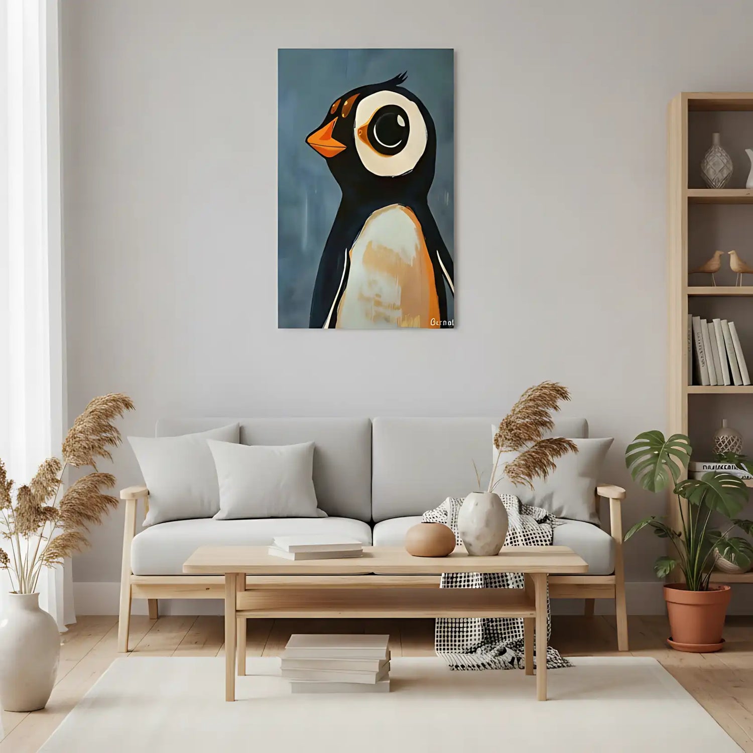 Illustration d'un pingouin avec des tons noirs, blancs et oranges, idéale pour une chambre enfantine.
