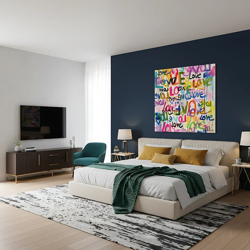 Oeuvre Pop Art avec mots 'Love' multicolores, ambiance joyeuse et dynamique pour salon moderne ou chambre d'adolescent.
