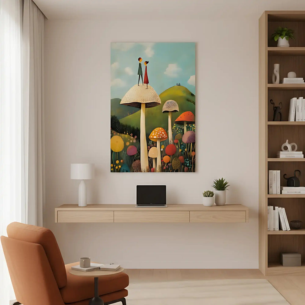 🎨 Cette illustration moderne fantaisiste vous transporte dans un univers féérique où champignons colorés et silhouettes romantiques coexistent en harmonie. Les tons terre et pastels chaleureux créent une atmosphère douce et onirique.