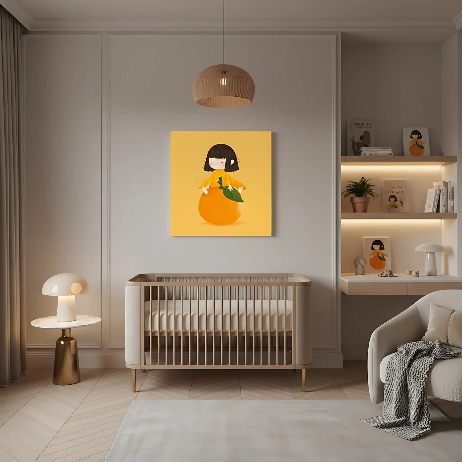 Illustration d'une petite fille souriante assise sur une orange, style ludique et coloré, parfaite pour chambre d'enfant.