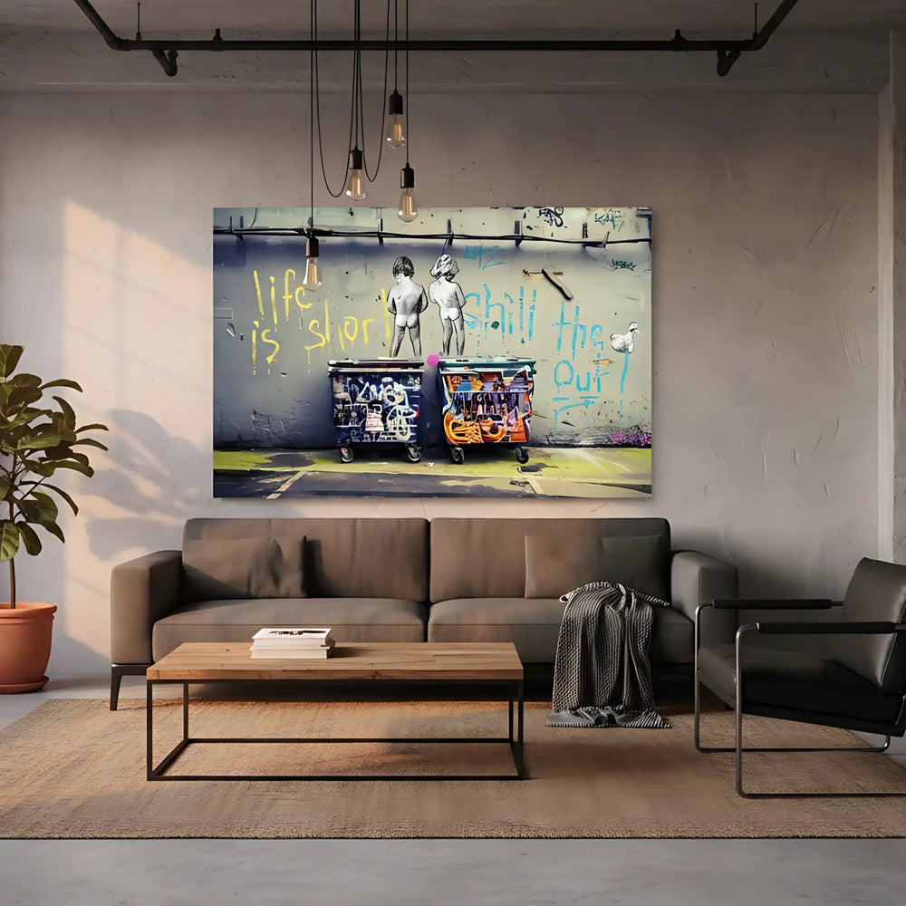 Street art avec enfants en noir et blanc, graffitis colorés sur mur gris, ambiance urbaine et réflexion sur la vie.