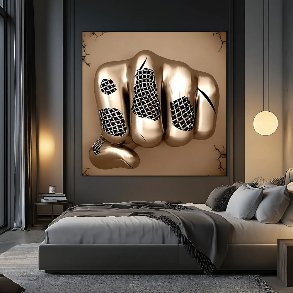 🎨 Cette sculpture numérique hyperréaliste capture un moment de pure force explosive : un poing métallique aux reflets bronze doré perce une surface alvéolaire dans un élan de détermination absolue. Les textures métalliques polies et les jeux de lumière sophistiqués créent une œuvre d'un réalisme saisissant.
