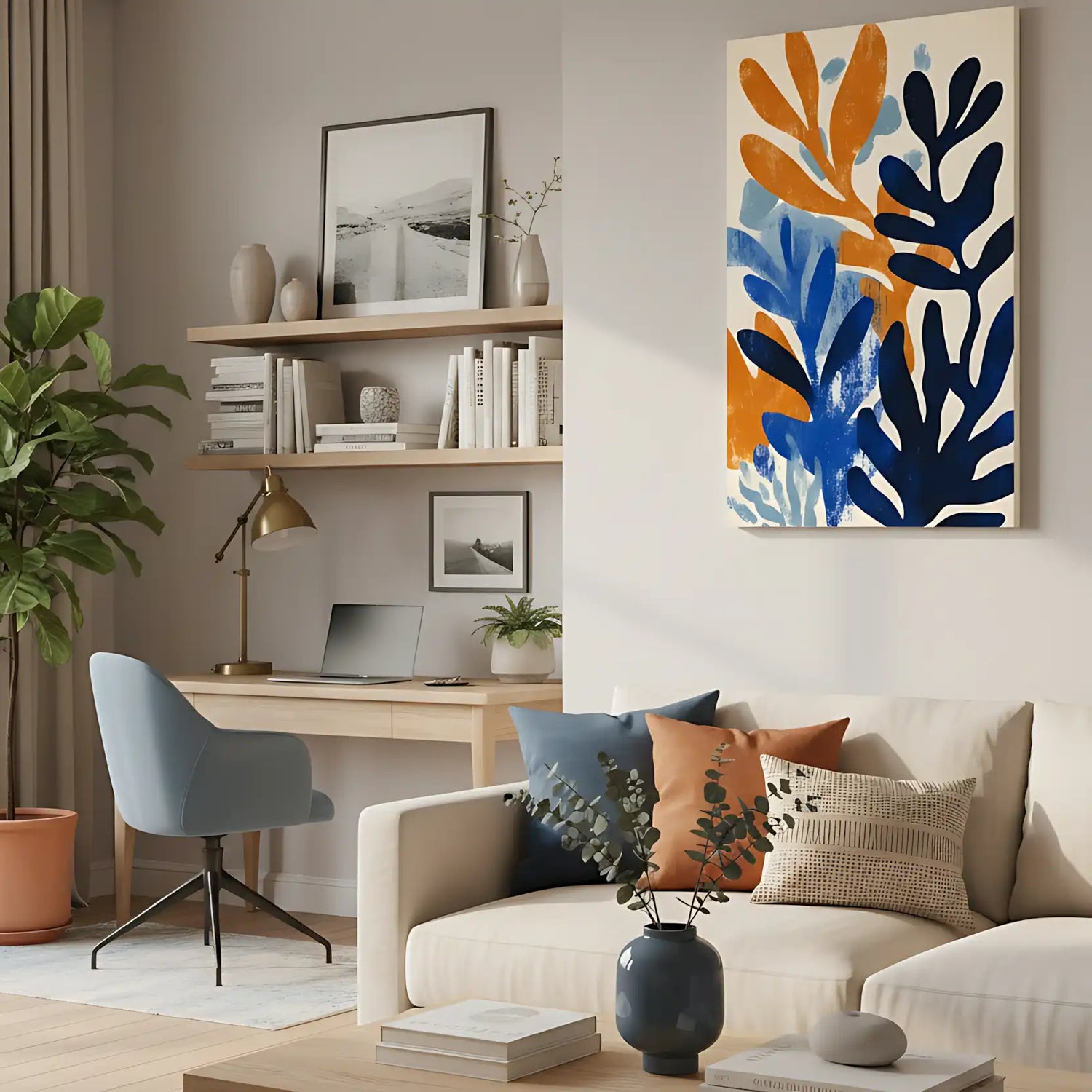 Peinture abstraite avec des formes organiques en bleu, orange et bleu clair,idéale pour une décoration moderne de salon.