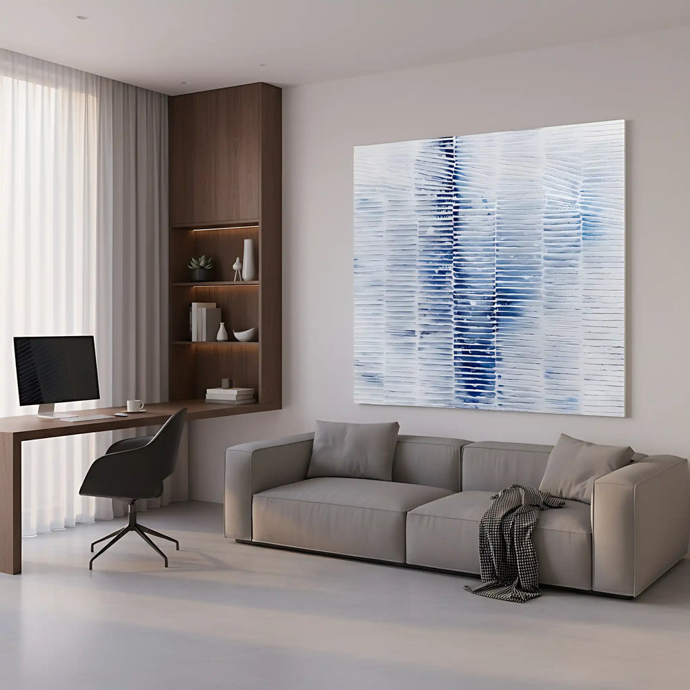 ⚡ L'énergie de calme et sérénité émane de cette composition horizontale rythmée, où le bleu cobalt dialogue harmonieusement avec le blanc et les gris pâles. Une atmosphère méditative se déploie naturellement.