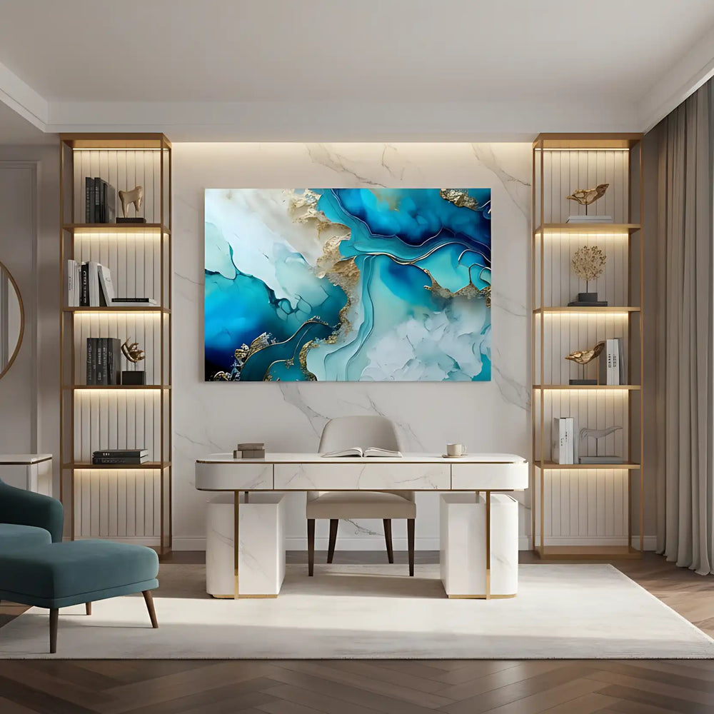 Tableau abstrait avec bleus profonds et dorés lumineux, ambiance sereine et élégante pour salon ou bureau moderne.