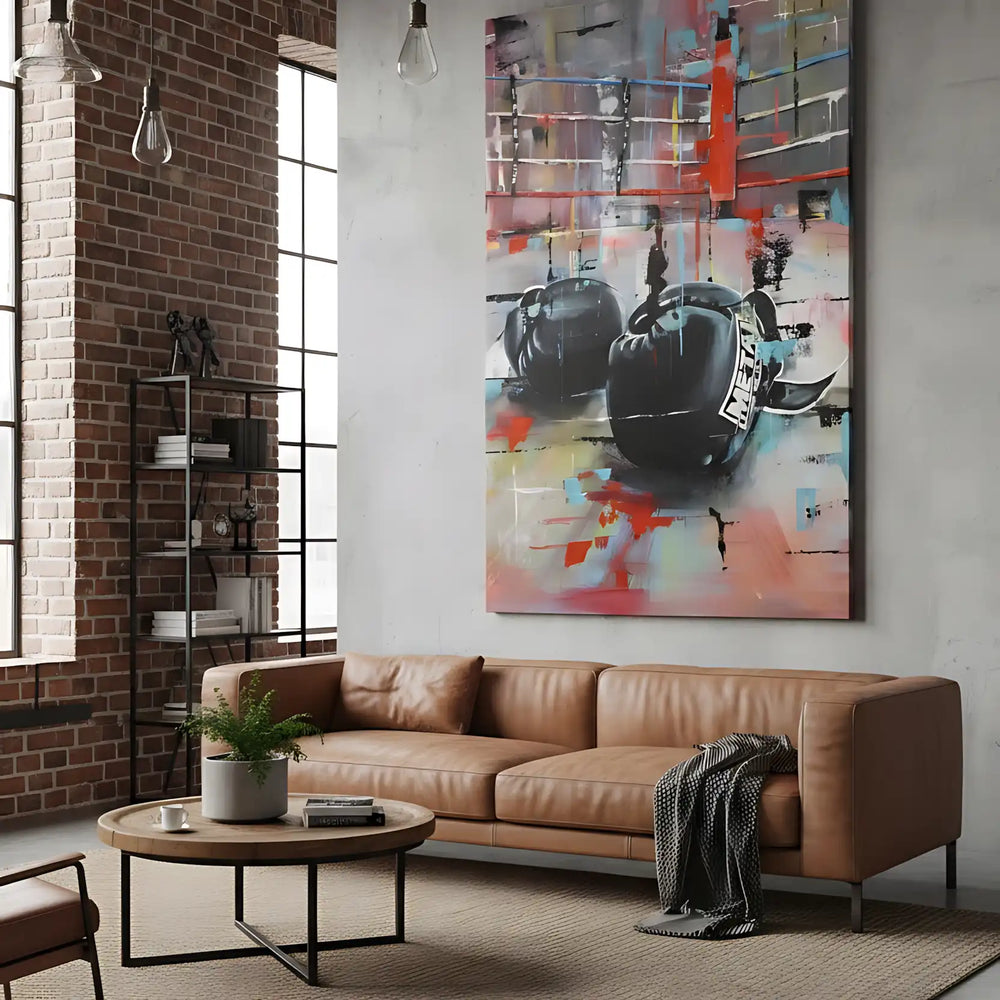Tableau abstrait avec gants de boxe noirs, couleurs vives et dynamiques, ambiance énergique pour salon moderne ou bureau.