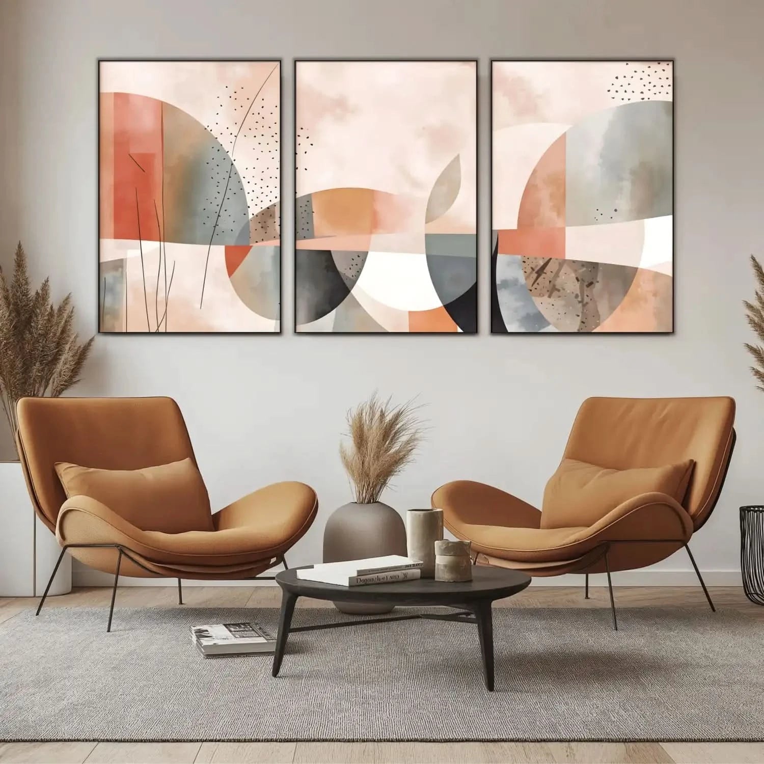 Cette œuvre abstraite présente une composition délicate de formes géométriques aux teintes pastel. Les nuances de beige, rose pâle et gris se mêlent harmonieusement, créant une ambiance douce et apaisante. Les courbes fluides et les lignes nettes se rencontrent subtilement, offrant une texture visuelle captivante. L'atmosphère sereine de cette peinture est idéale pour un salon ou une chambre, apportant une touche de tranquillité et d'élégance. L'équilibre des couleurs et des formes invite à la contemplation et à la détente, transformant l'espace en un havre de paix et de raffinement.
