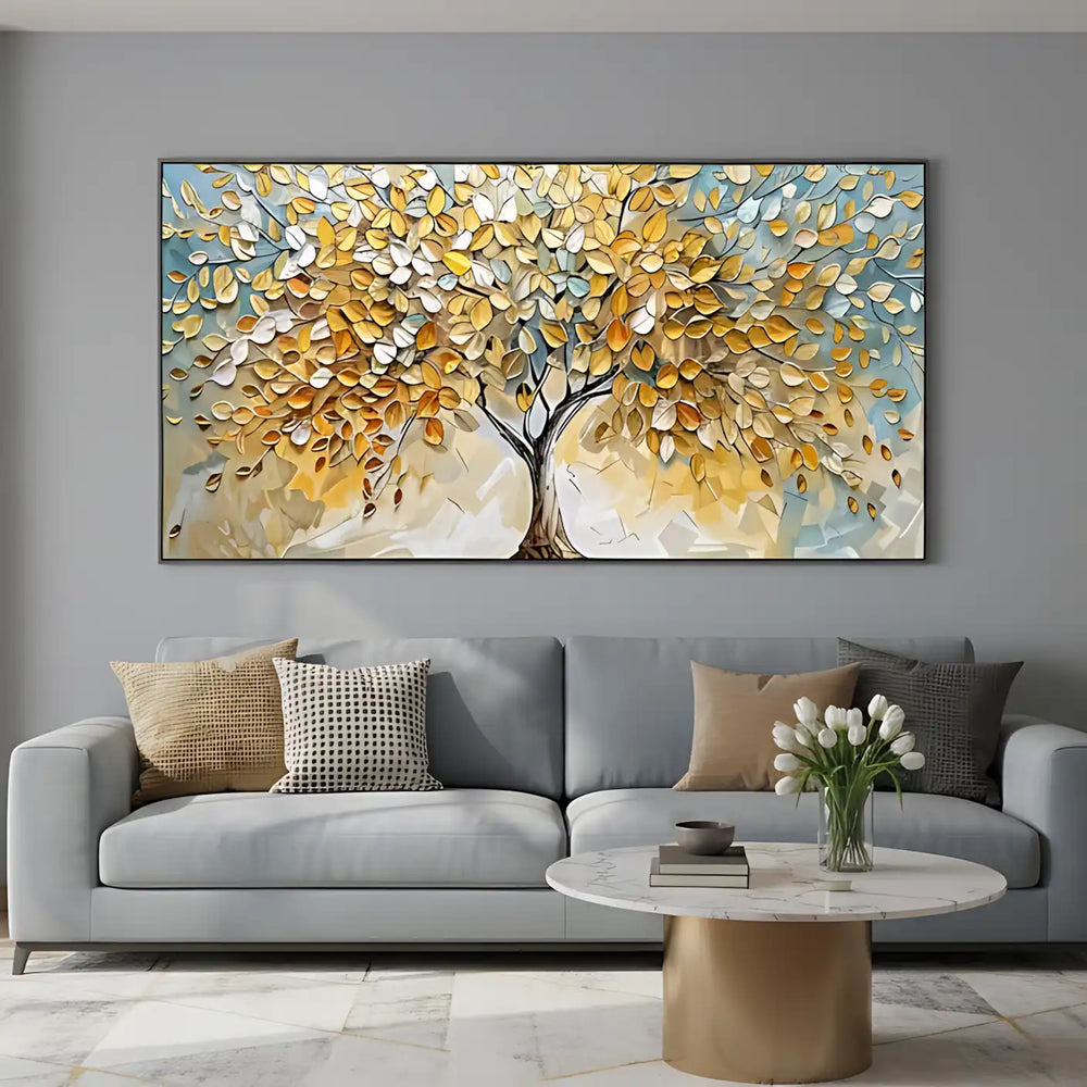 🎨 Cette œuvre d'art mural 3D révèle un majestueux arbre doré aux feuilles en relief tridimensionnel. Les nuances d'or et blanc nacré créent une atmosphère luxueuse et chaleureuse, sublimée par des touches de beige et bleu ciel.