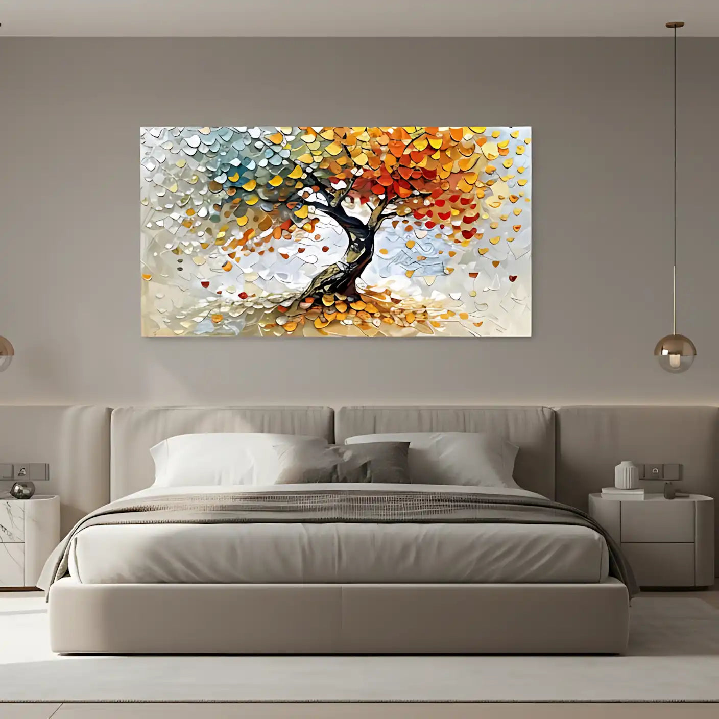 Arbre abstrait multicolore aux feuilles rouges, jaunes et vertes célébrant les saisons, pour un salon ou un bureau.
