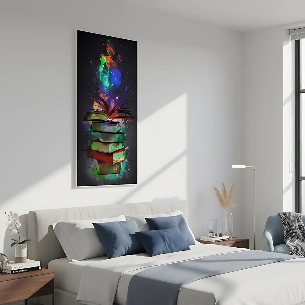 Tableau de livres avec volutes de couleurs éclatantes, ambiance mystérieuse et inspirante pour bureau ou bibliothèque.