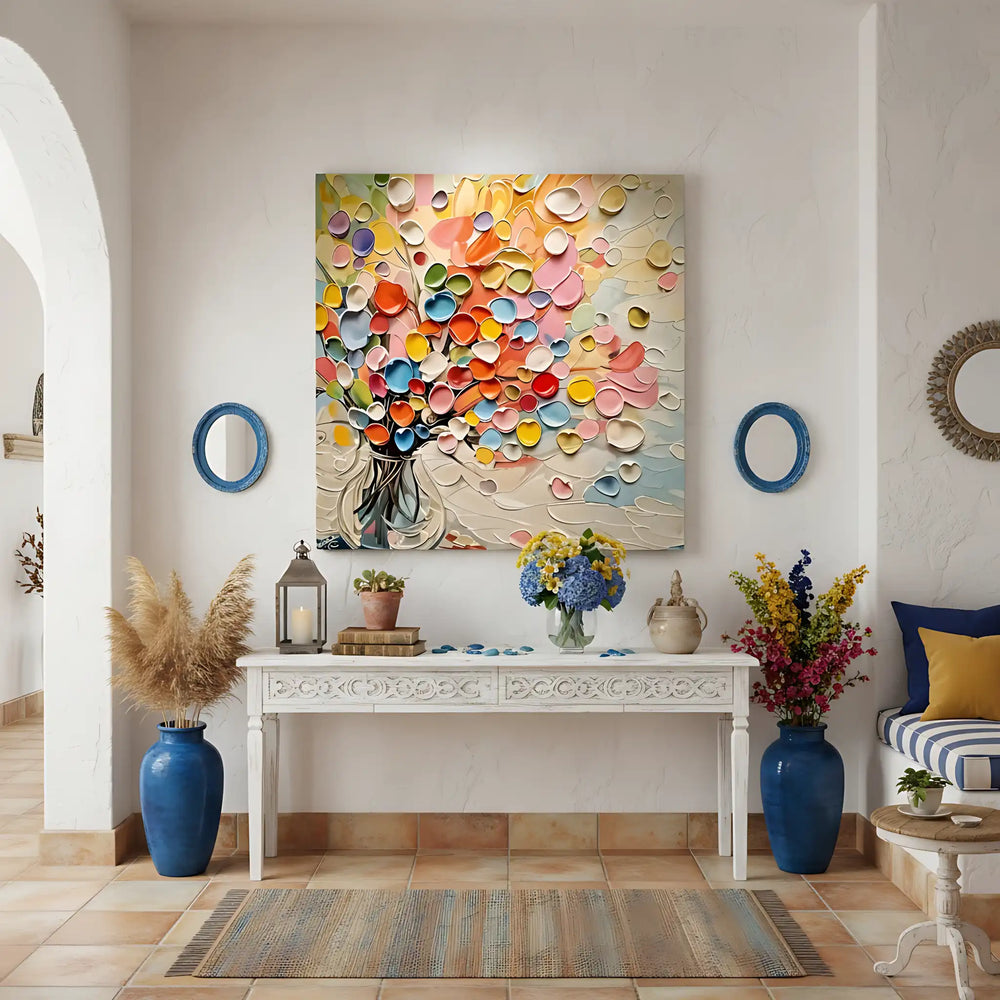 🎨 Une explosion florale tridimensionnelle où chaque pétale prend vie dans un relief saisissant. Cette création contemporaine transforme l'art floral traditionnel en une symphonie de couleurs arc-en-ciel qui danse entre orange lumineux, rose délicat, bleu profond et jaune éclatant.