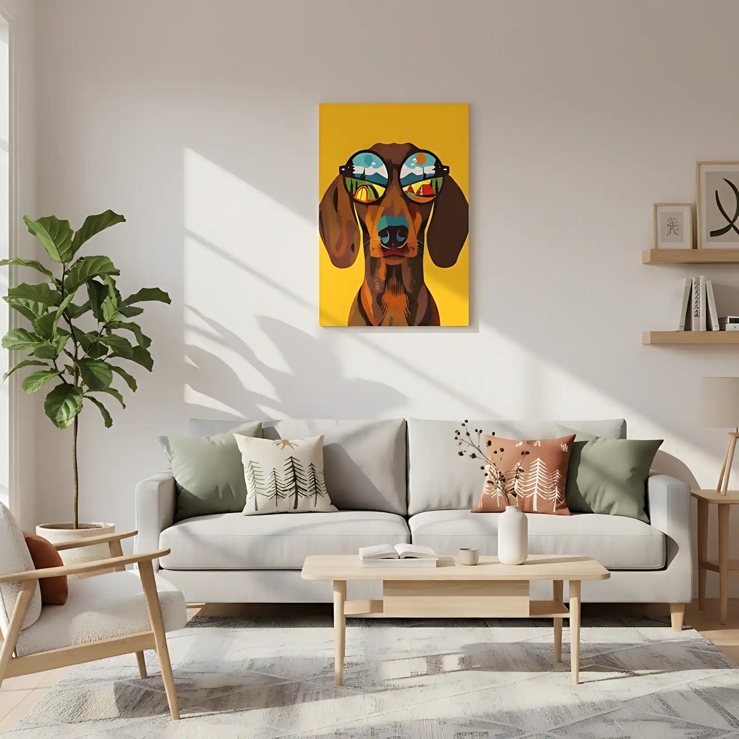 🎨 Ce Pop Art contemporain capture l'esprit d'aventure à travers le regard pétillant d'un teckel à lunettes. Dans ses verres se reflète un univers de liberté : tentes colorées et montagnes majestueuses qui invitent au voyage.