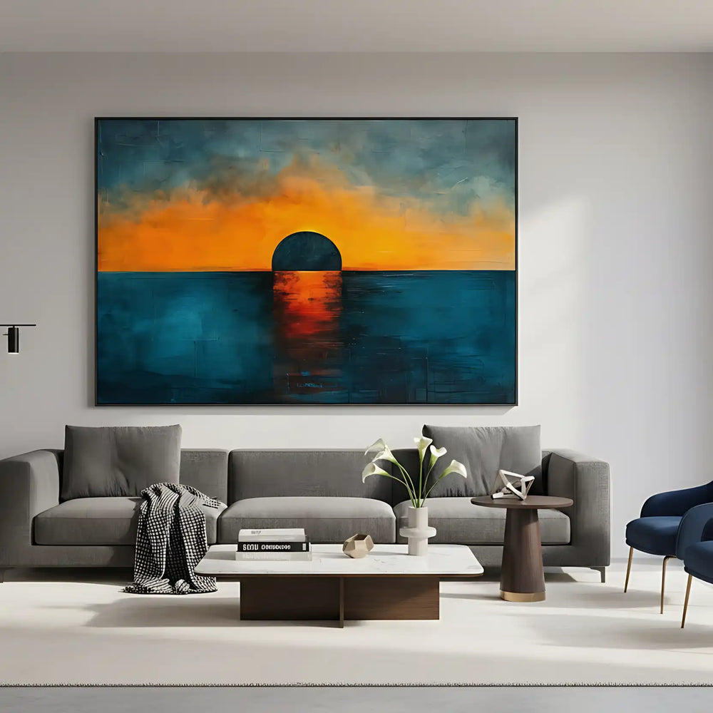 🎨 Cette œuvre capture la beauté dramatique d'un coucher de soleil océanique à travers une interprétation abstraite géométrique. Le soleil noir, parfaitement circulaire, se reflète dans les eaux calmes tandis que les couleurs flamboyantes d'orange et de bleu profond créent un contraste saisissant.