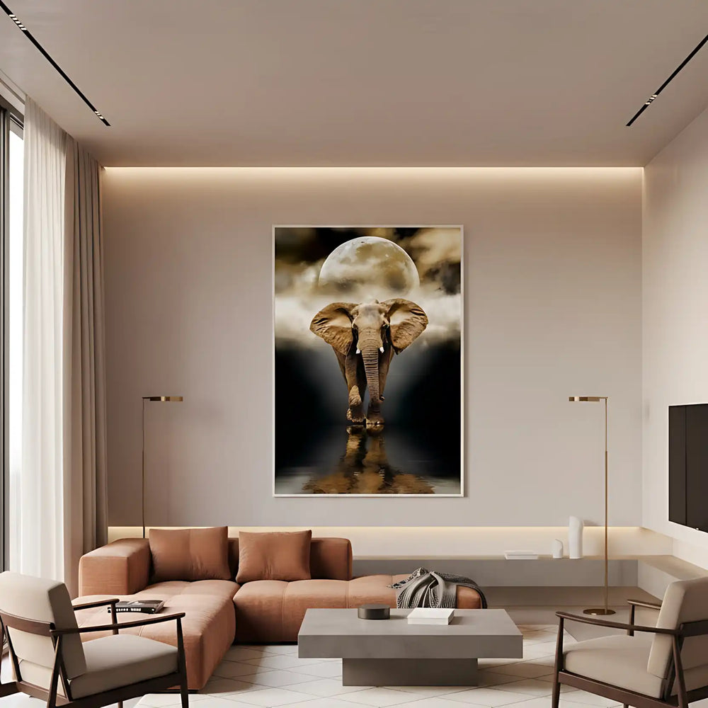 Éléphant majestueux marchant dans l'eau sous une pleine lune dorée, avec reflet et ambiance mystique, tons bruns et noirs.