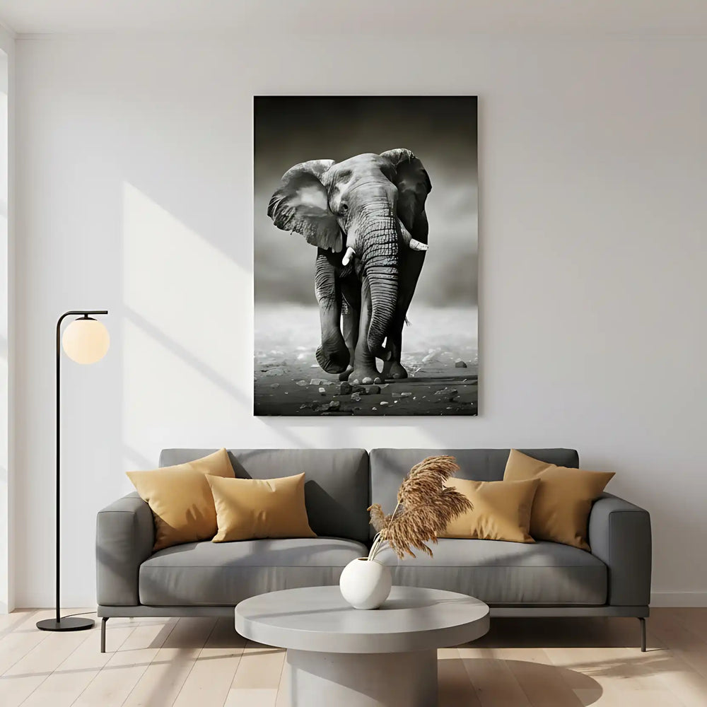 🎨 Cette photographie noir et blanc capture la majesté brute d'un éléphant africain dans toute sa splendeur. Le contraste dramatique révèle chaque ride de sa peau ancestrale, créant une œuvre d'une puissance visuelle saisissante.