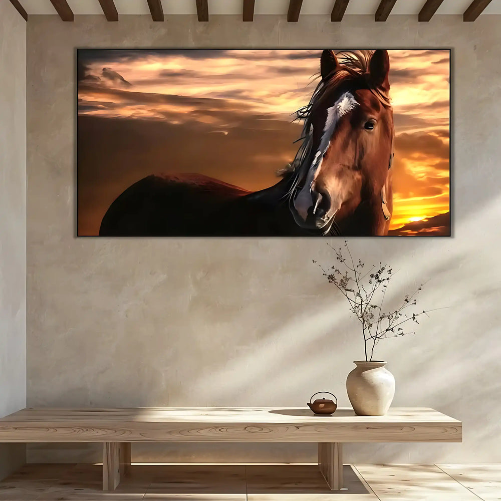 Cheval majestueux sur fond de ciel crépusculaire doré et orangé, ambiance sereine et puissante pour salon ou bureau.
