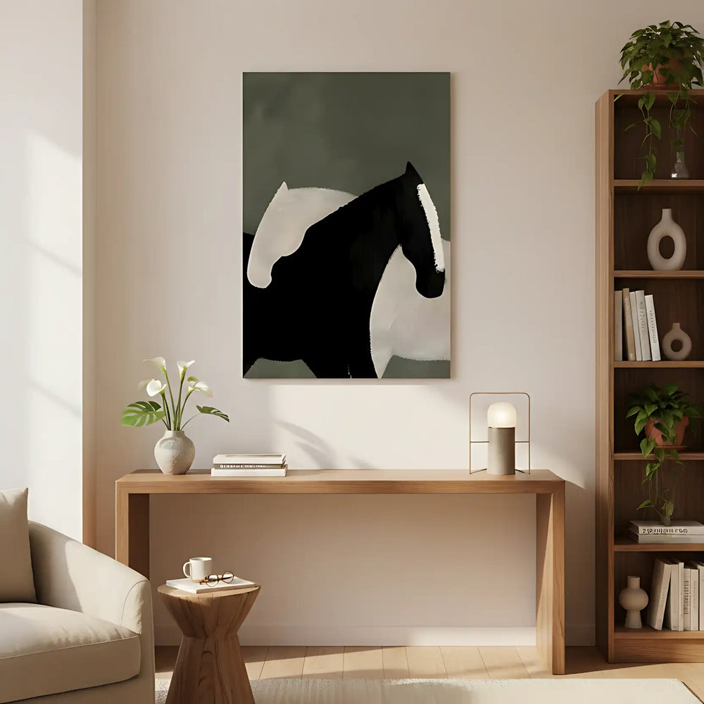 🎨 Cette œuvre minimaliste contemporaine capture l'essence pure de la connexion à travers deux silhouettes de chevaux en noir et blanc, unis dans une étreinte silencieuse. Les contrastes saisissants révèlent la beauté de la complémentarité.
