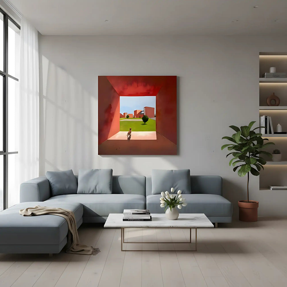 🎨 Une composition audacieuse où l'architecture moderne rencontre la contemplation féline. Le rouge corail vibrant de la structure géométrique crée un cadre saisissant vers un paysage verdoyant, sublimé par la présence silencieuse d'un chat observateur.