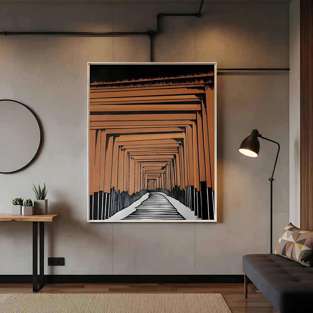 Tableau géométrique avec portails orange et noir, perspective infinie, ambiance mystérieuse pour bureau ou salon moderne.