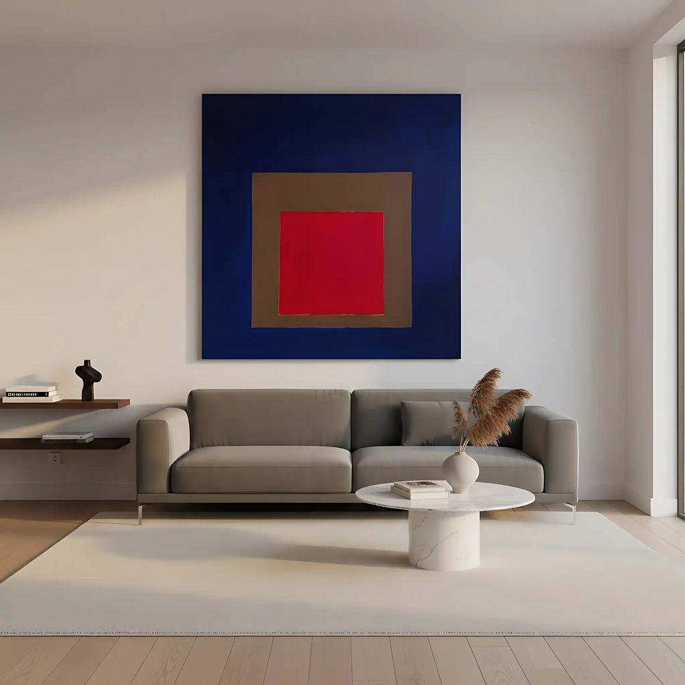 🎨 Cette œuvre d'art géométrique minimaliste révèle la beauté pure des formes concentriques. Trois carrés emboîtés déclinent une palette de bleu profond, brun terre et rouge vif, créant un dialogue chromatique d'une rare intensité.