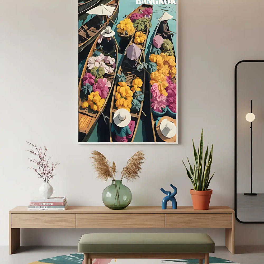 🎨 Plongez dans l'univers coloré des marchés flottants thaïlandais avec cette œuvre Pop Art tropical saisissante. Les bateaux traditionnels débordent de fleurs exotiques aux teintes éclatantes, créant une symphonie visuelle captivante.