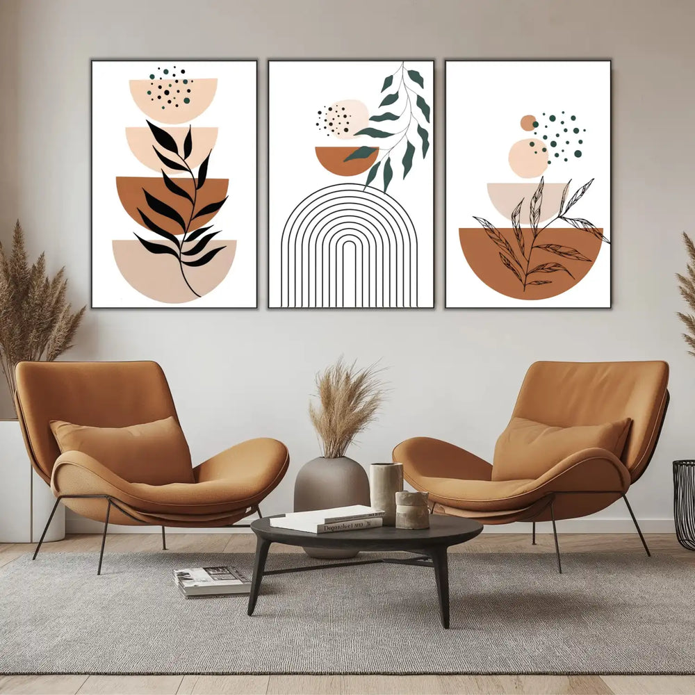 Tableau minimaliste avec formes géométriques beige et marron, motifs de feuilles noires, ambiance sereine pour salon moderne.