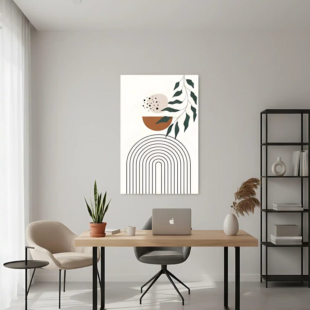 🎨 Cette création moderne conjugue éléments botaniques stylisés et formes géométriques épurées dans une composition verticale rythmée. Les feuilles délicates s'harmonisent avec des demi-cercles abstraits, créant un dialogue poétique entre nature et géométrie.