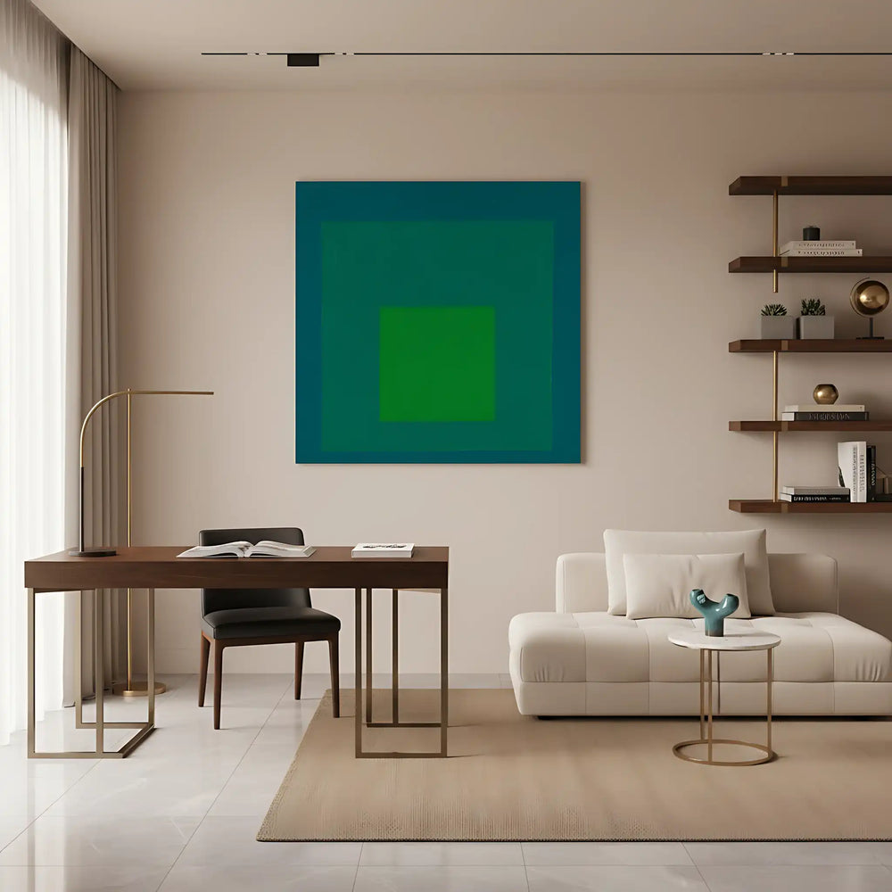 Tableau minimaliste avec carrés concentriques en vert émeraude et bleu profond, ambiance calme et équilibrée pour bureau mode