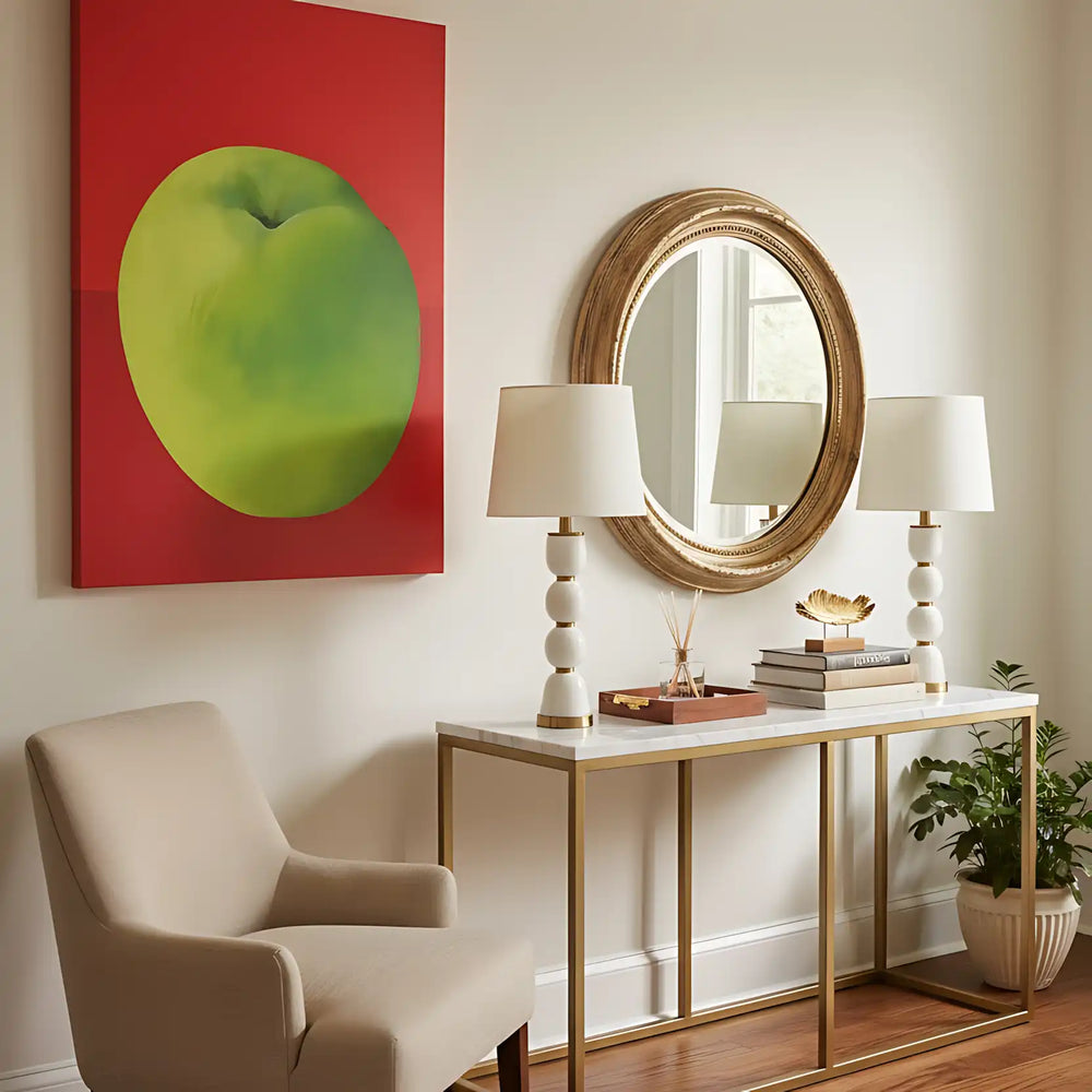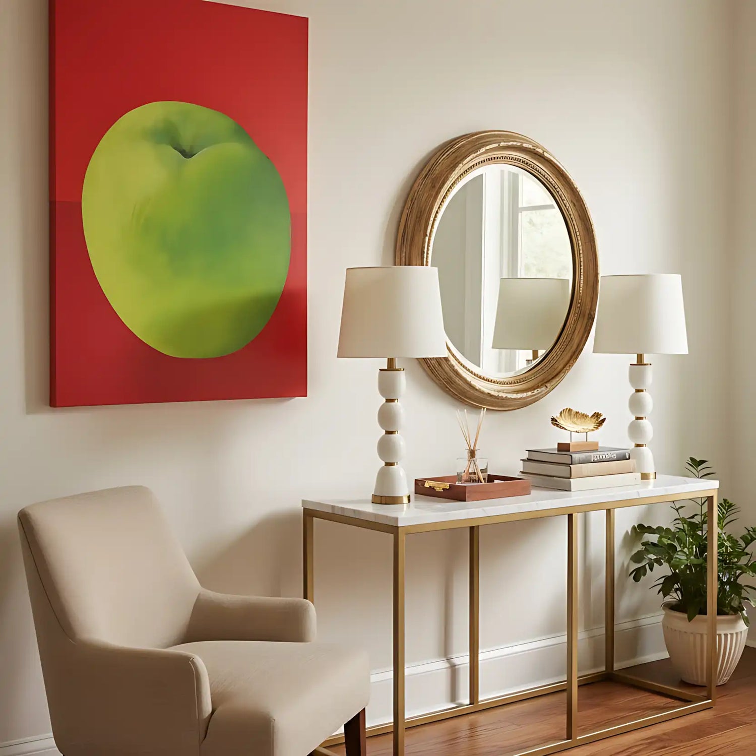 Tableau moderne avec une pomme verte vibrante sur fond rouge profond, style minimaliste, idéal pour cuisine ou salon contempo