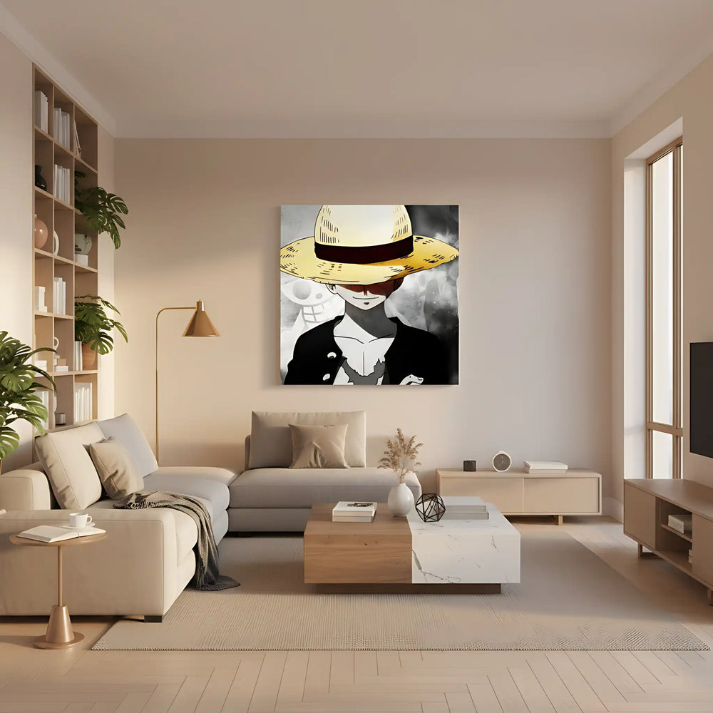 Personnage mystérieux avec chapeau de paille jaune, fond noir et blanc, ambiance intrigante pour salon moderne.